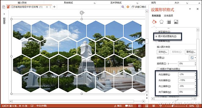 按Ctrl+A全选所有图形,然后再按Ctrl+G进行组合,右击组合的图形选择“设置图形格式”,然后在右侧选择“填充”下的“图片或纹理填充”,单击“文件”插入一张图片填充组合图形,此时会看到图片已经被分解填充到单个图形中(图7)。如果感觉图片的位置不太好,可以在向左、向右、向上、向下偏移中进行修改。