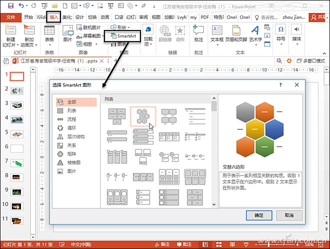 打开Powerpoint2016,切换到“插入”选项卡,单击“SmartArt”弹出对话框(图1),选择“列表”下的“交替六边形”,单击“确定”按钮即可插入图形。