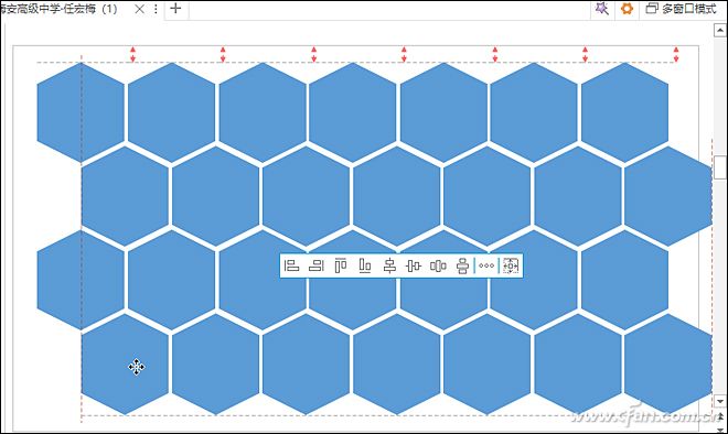 切换到“插入”选项卡,单击“形状”选择“六边形”,然后按住Shift键不放,绘制出一个正六边形,然后旋转正六边形让其一条边垂直,按Ctrl+D复制图形若干,然后拖动排成一排。选中所有图形,切换到“格式”选项卡,使用“对齐”中的“顶端对齐”和“横向分布”,让六边形排列的更加均匀。选中所有图形,然后按住Ctrl键不放,向下拖动并进行对齐,松开鼠标即可复制。这样复制若干排让蜂窝图覆盖差不多整个页面(图6)。