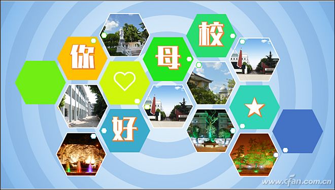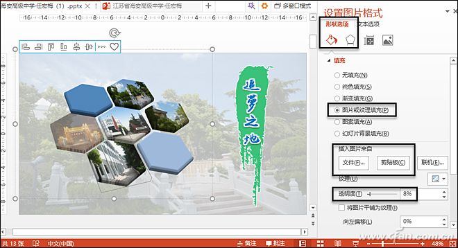 选中蜂窝图中间的六边形,右击选择“设置图形格式”,单击左侧的“填充与线条”,选择“图片或纹理填充”,然后单击“文件”按钮插入图片,再修改“透明度”,用这种方法为其它图形添加图片,最后设置背景并添加文字,这样一个极具艺术感的封面就出炉啦(图3)。