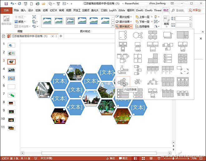 切换到“插入”选项卡,单击“图片”弹出对话框,按住Ctrl键不放,可选中多张图片一次性导入。选中所有的图片,切换到“格式”选项卡,单击“图片版式”选择“六边形群集”,图片就会自动排版(图4)。