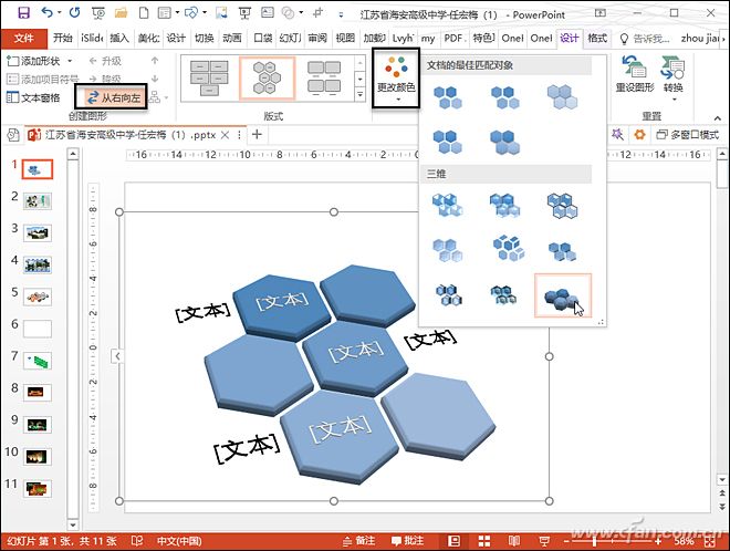 选中图形,切换到“设计”选项卡(图2),单击“从右往左”按钮修改方向,单击“更改颜色”可以选择内置的色彩库,最后在“SmartArt样式”中可以选择蜂窝图的外观。右击图形选择“转换为图形”,然后复制最左侧图形,粘贴到右侧,并稍微缩小。