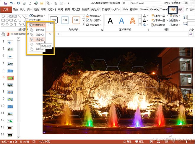 先选中图片,然后按住Shift不放,拖动选中所有图形,切换到“格式”选项卡(图9),选择“合并图形”下的“拆分”,将大图拆分小图,最后删除图片中不需要的部分,此时就会剩下蜂窝图。