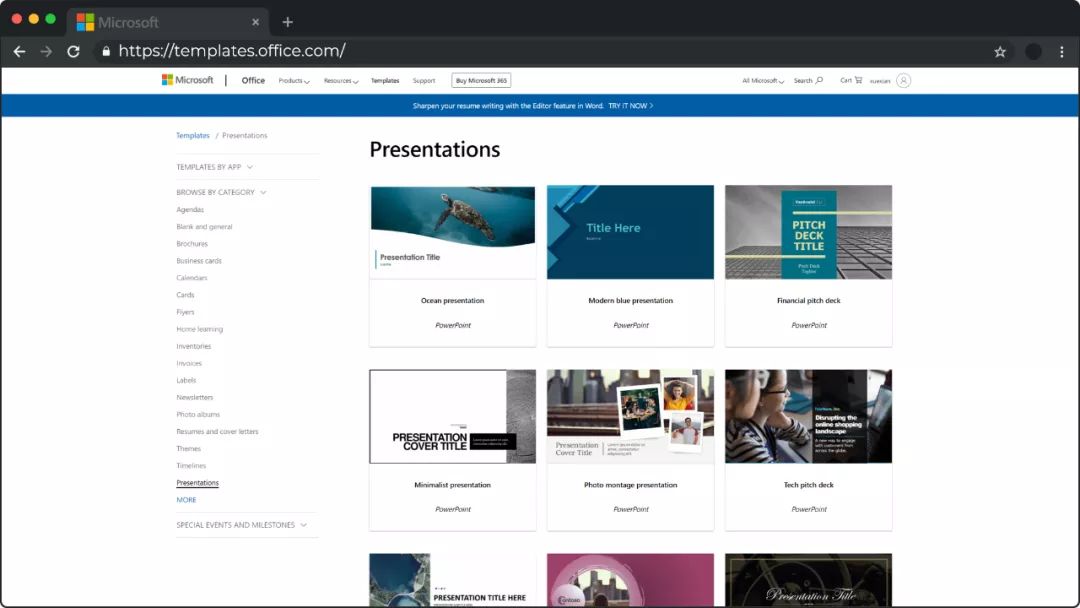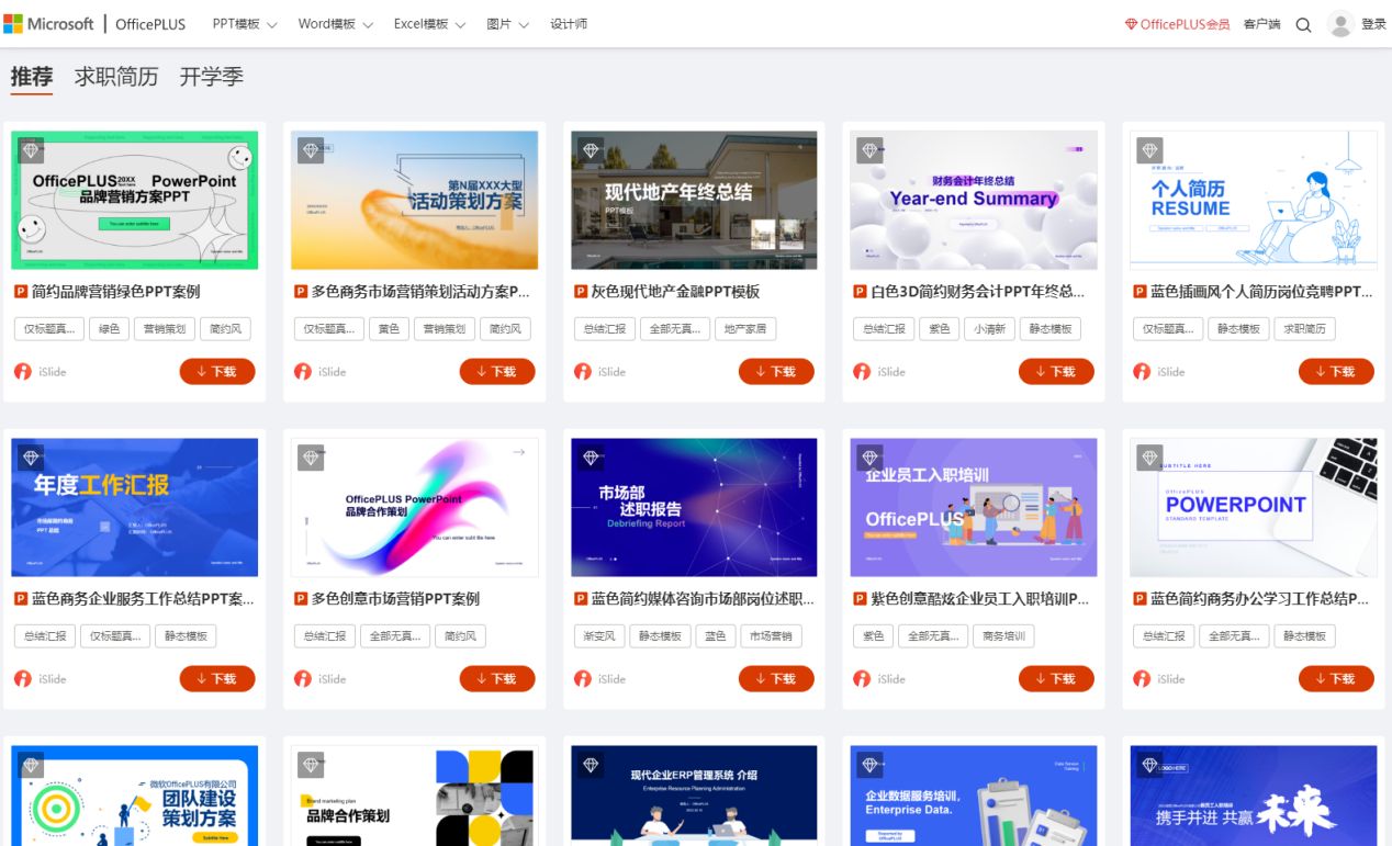 微软Office官方在线模板网站,为我们提供了各类精品PPT模板、PPT实用模块、Word求职简历、Excel图表和图片素材等资源,成为大家职场和生活的加油站!该网站根据用途、风格、图表和功能页对模板进行分类,方便我们查找与下载。
