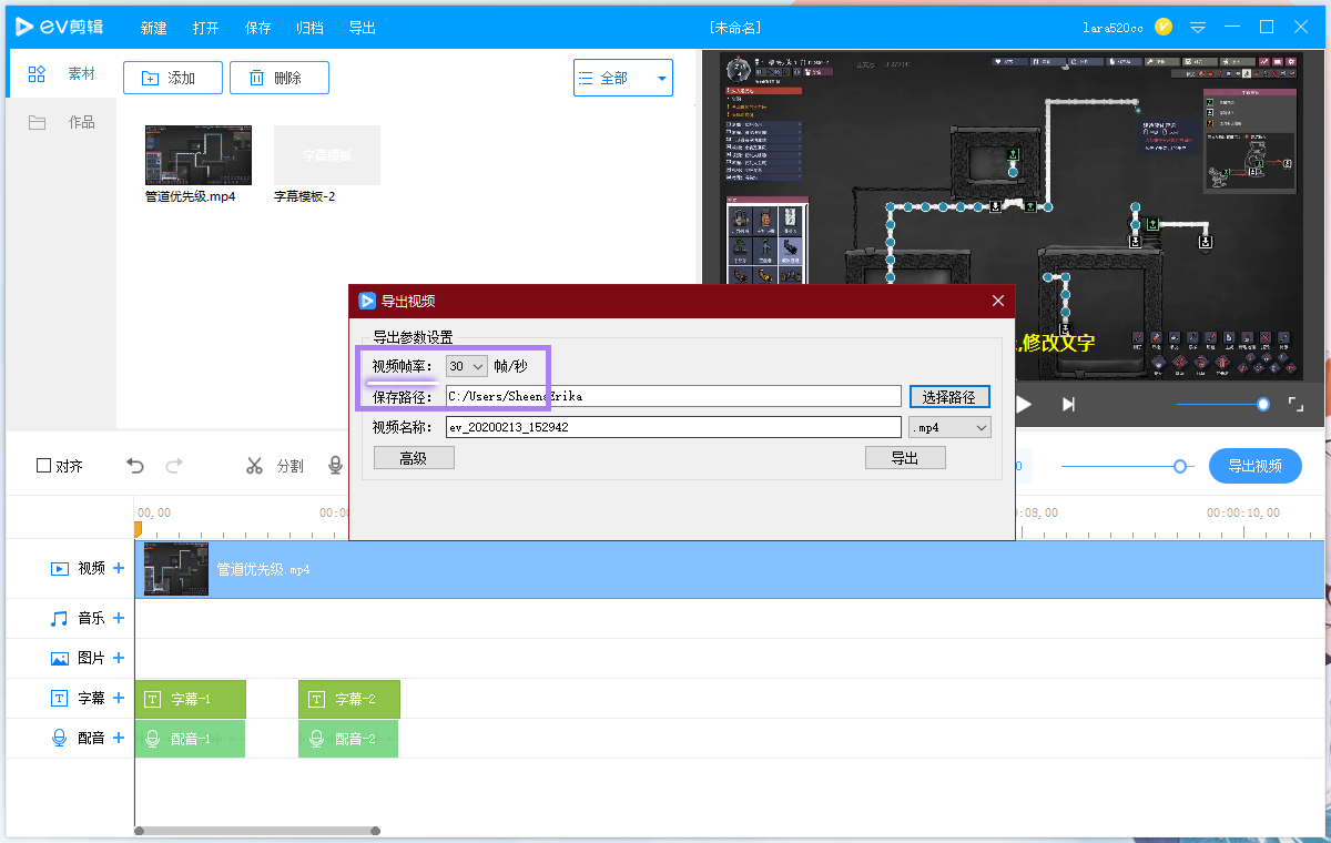 7.最后,当视频完成,并且检查了所有的素材无误后,就可以点击EV剪辑窗口右侧的「导出视频」进行保存了。
