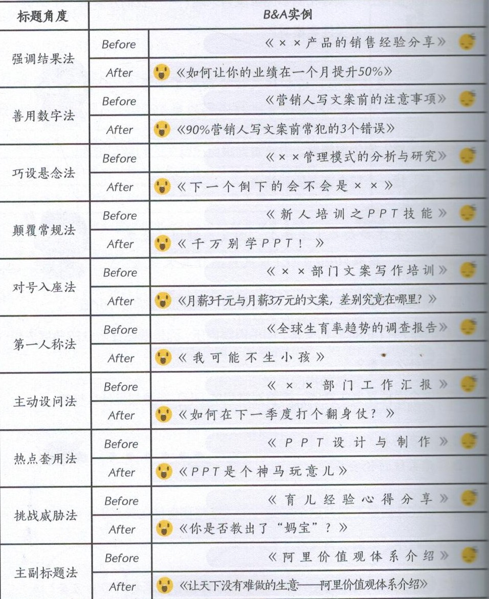 老秦在《说服力:工作型PPT该这样做》中给我们介绍了10个取标题的角度,大家可以借鉴一下。