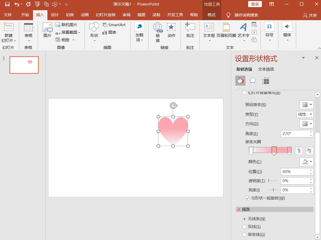 2.2、右键点击心形,选择【设置形状格式】-【填充】-【渐变填充】,【类型】随意,【方向】随意,在【渐变光圈】中选择自己喜欢的颜色,也适当设置一下透明度,在【线条】处勾选-【无线条】