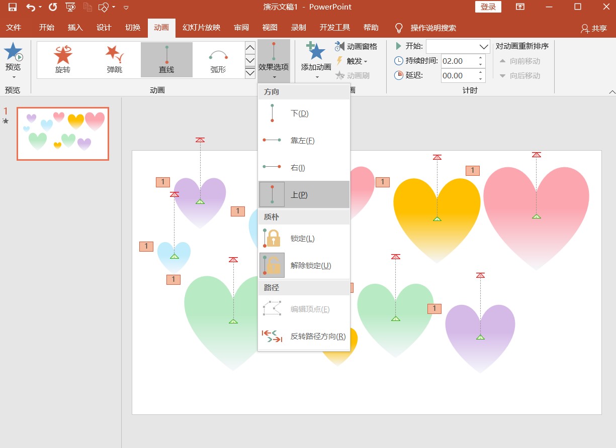 4.3.接下来我们选中所有的气泡,点击【路径动画】中选择【直线】, 【路径方向】为【上】。