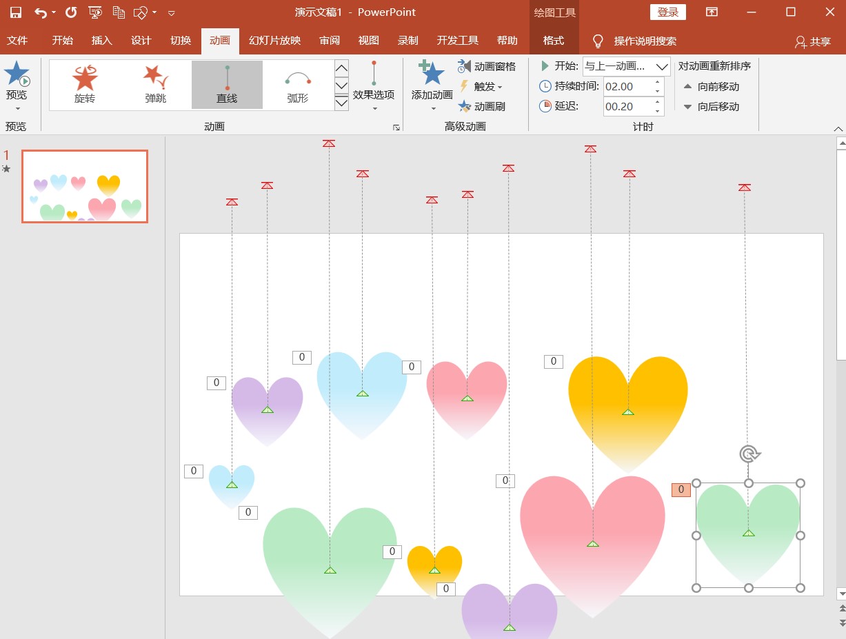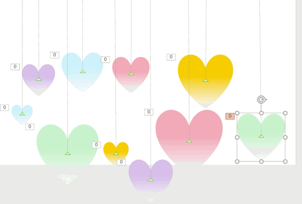 5.4.这时你会发现,爱心是同时上升的,为了制作出放飞效果,我们可以调整一下路径的长度,然后为每个气泡设置不同的延迟时间