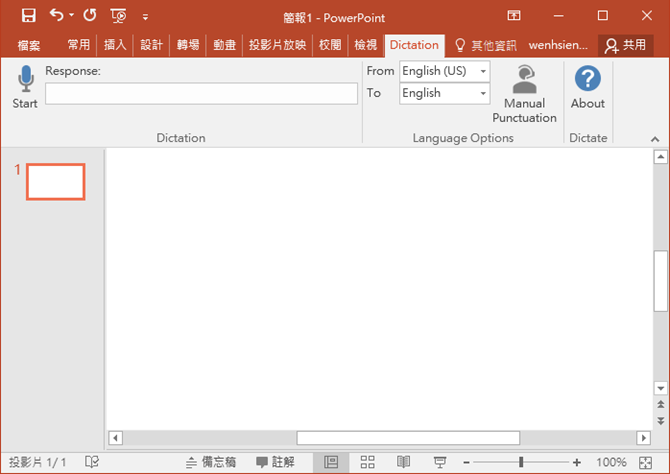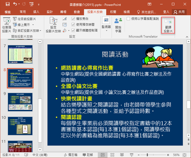 安装完成后,在「幻灯片放映」菜单下,可以选取「翻译投影片」: