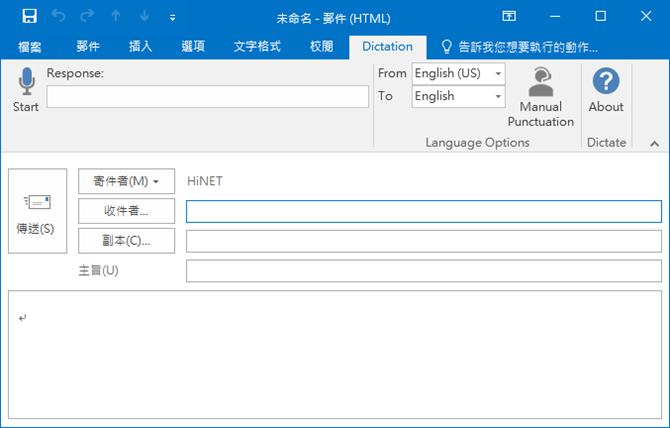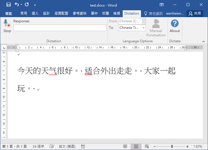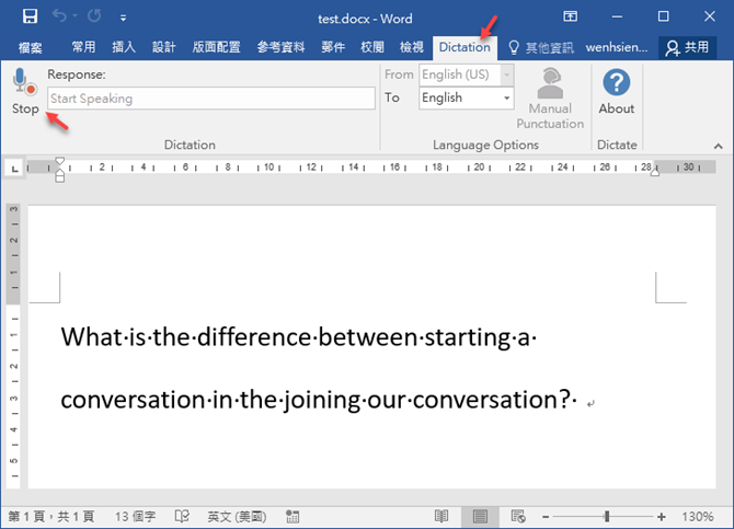按下 Start,开始讲话,在 Word 文件中就会即产生你指定(To)的语言文字。