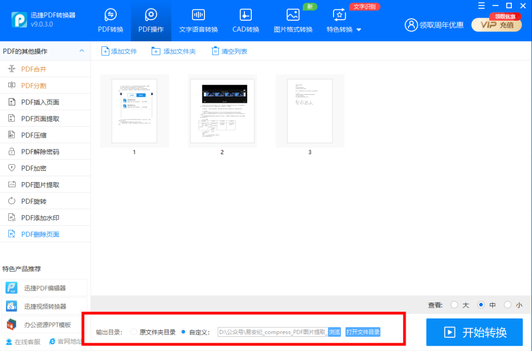 添加完文件后,在界面的下方设置文件的保存路径,有自定义和原文件目录两种可选择;此操作是为了方便后期查找;