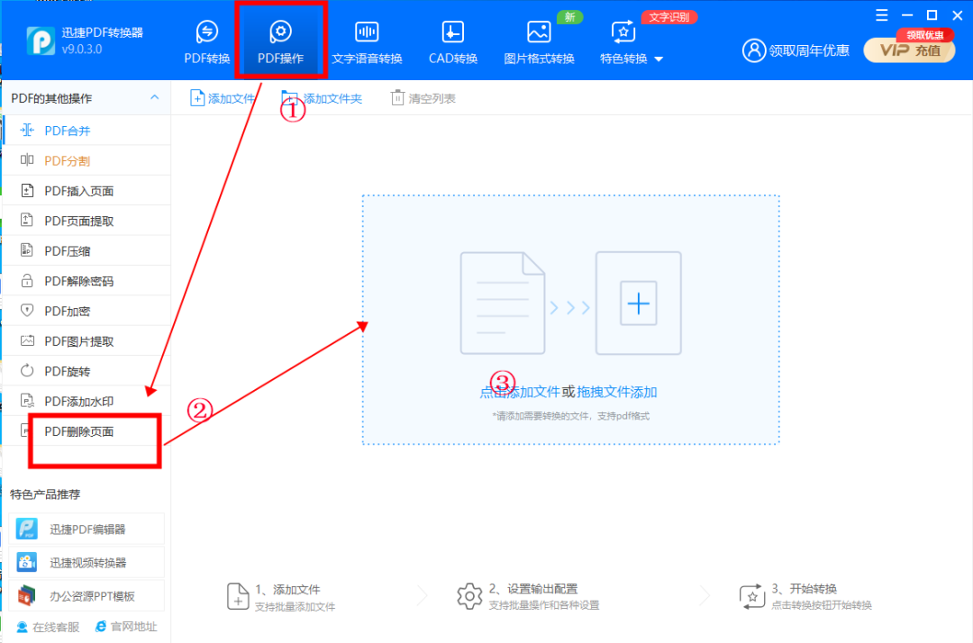下载完成后,启动软件,进入首页,找到【PDF操作】——【PDF删除页面】然后点击添加文件或是直接拖拽文件到界面;