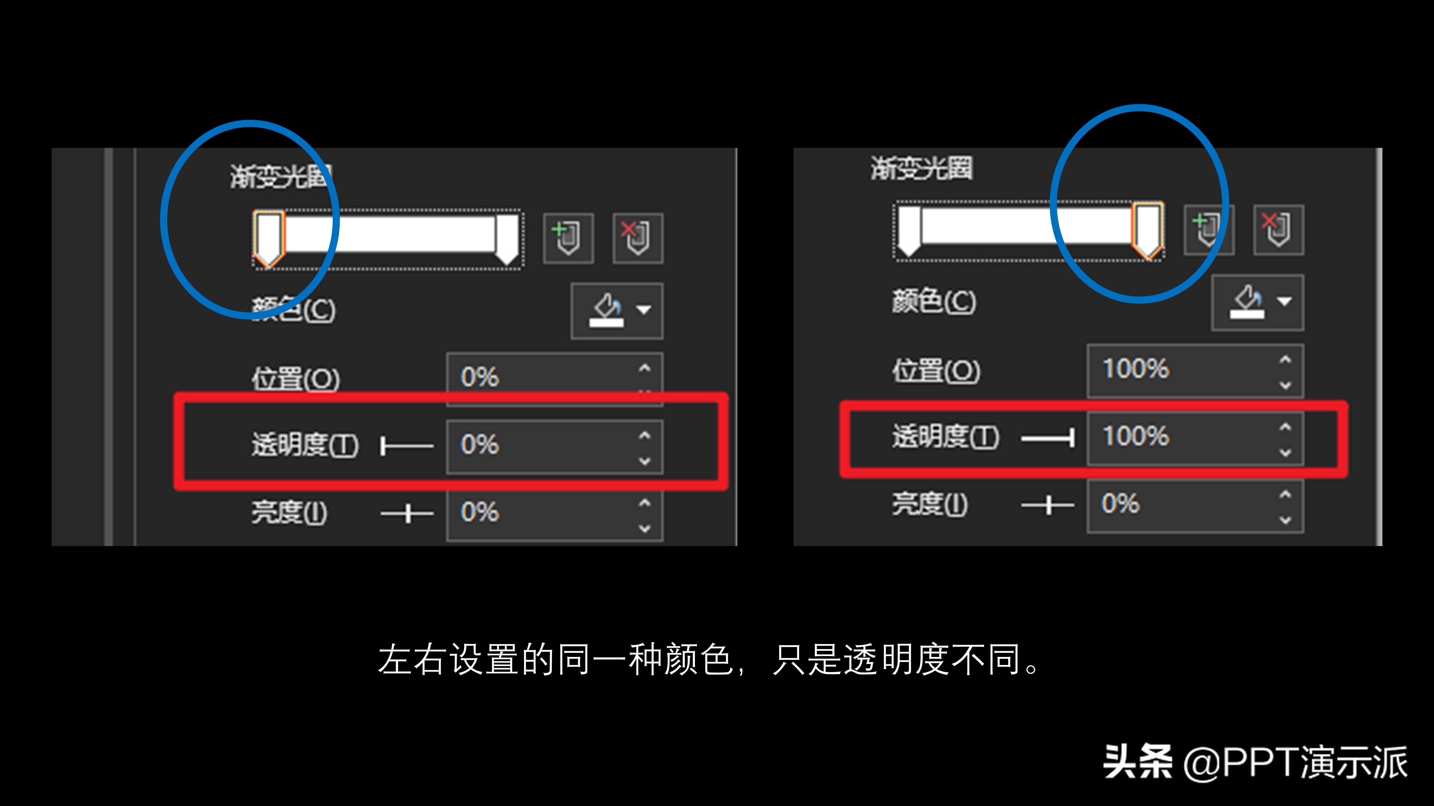 一般做渐隐字效果,两端选择同一种颜色,透明度不同即可: