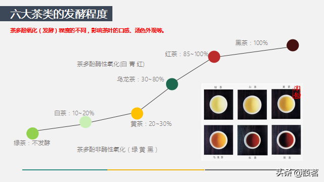 茶多酚氧化(发酵)程度的不同,影响茶叶的口感、汤色外观等。