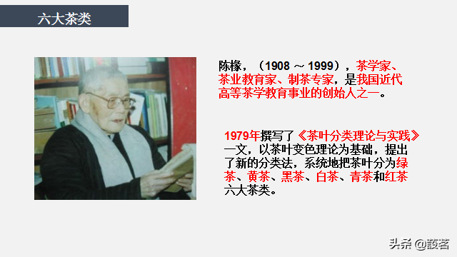 1979年撰写了《茶叶分类理论与实践》一文,提出了新的分类法,系统地把茶叶分为绿茶、黄茶、黑茶、白茶、青茶和红茶六大茶类。
