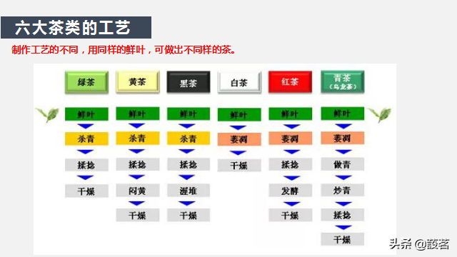 根据制作方法和茶多酚氧化(发酵)程度的不同,可分为六大类。