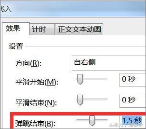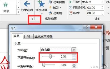 8.6、我们点击飞入设置“设置平滑开始为2秒,如图所示