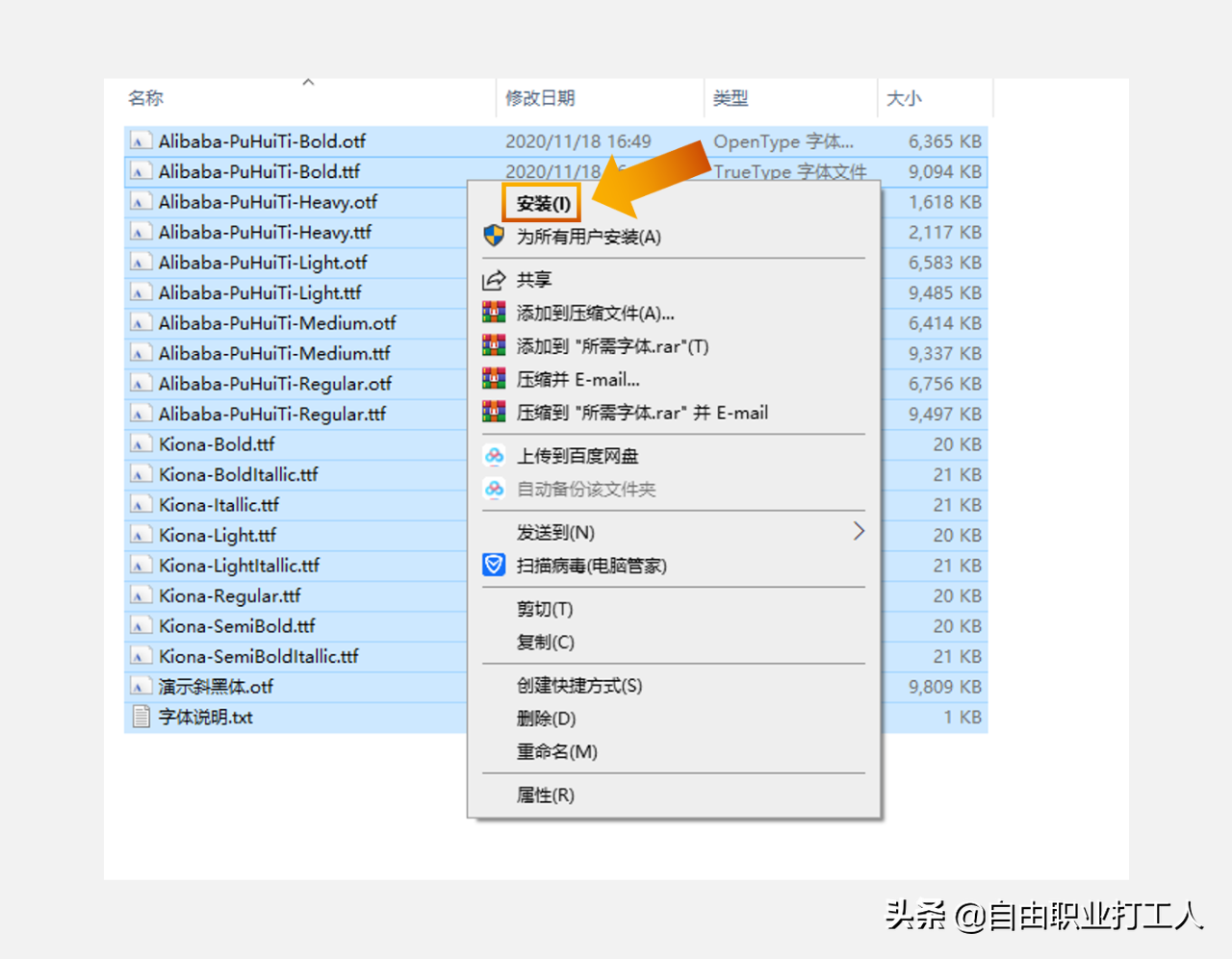 第二种全选所有字体安装包,右击其中一个,点击安装即可。
