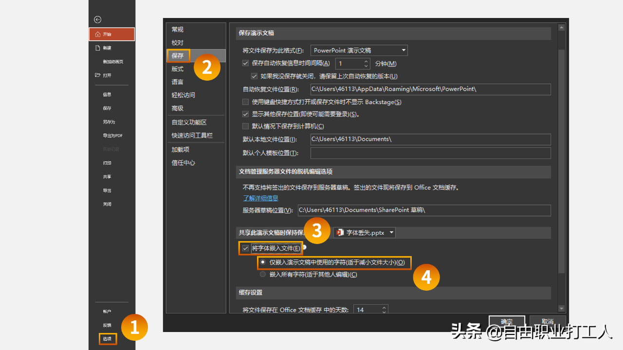 点击【文件】-【选项】-【保存】-【将字体嵌入文件】-【仅嵌入演示文稿中使用的字符】,这样一来就会把使用到的字体安装进PPT里。
