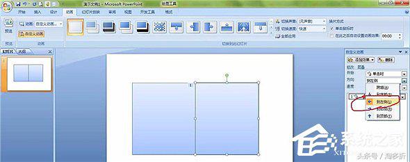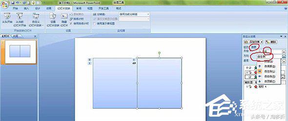 8、然后选中右侧矩形,接下来依次单击“添加效果→进入→伸展”,把“开始”设置为“之后”,把“方向”改为“自左侧”。