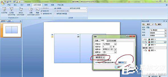 6、在自定义动画窗格内选中两个动画,单击其中一个下拉菜单,选择“计时→触发器”里的“矩形3”,这个矩形就是右侧的矩形。