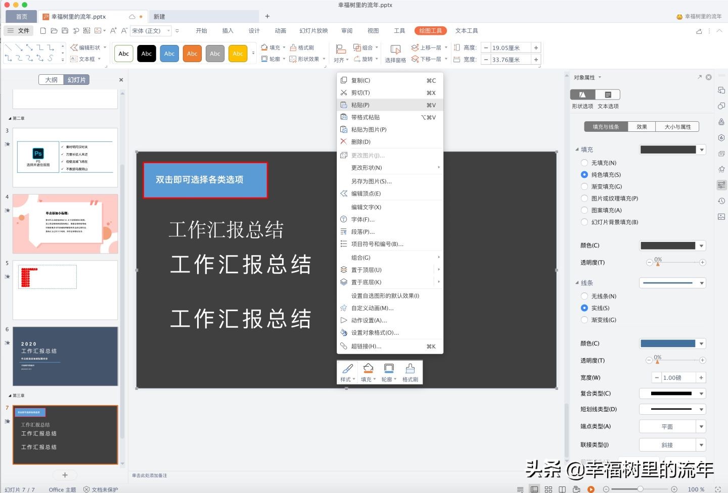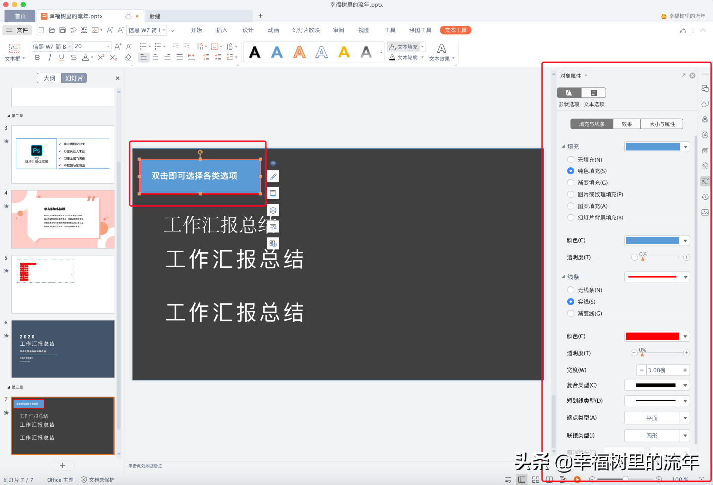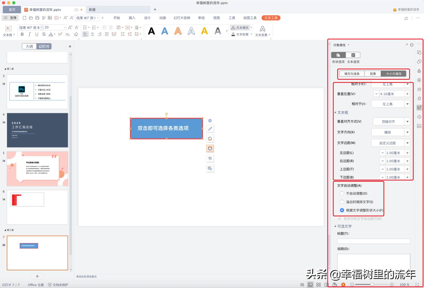 双击文本即可进入具体的设置选项,可以设置文本框的填充颜色纹理、描边、透明度、和字体的padding之类的,还可以设置宽度……,一些具体的属性需要亲自去尝试,这里不再做具体的说明,暂时知道入口就可以了,具体使用的时候再进行具体尝试吧