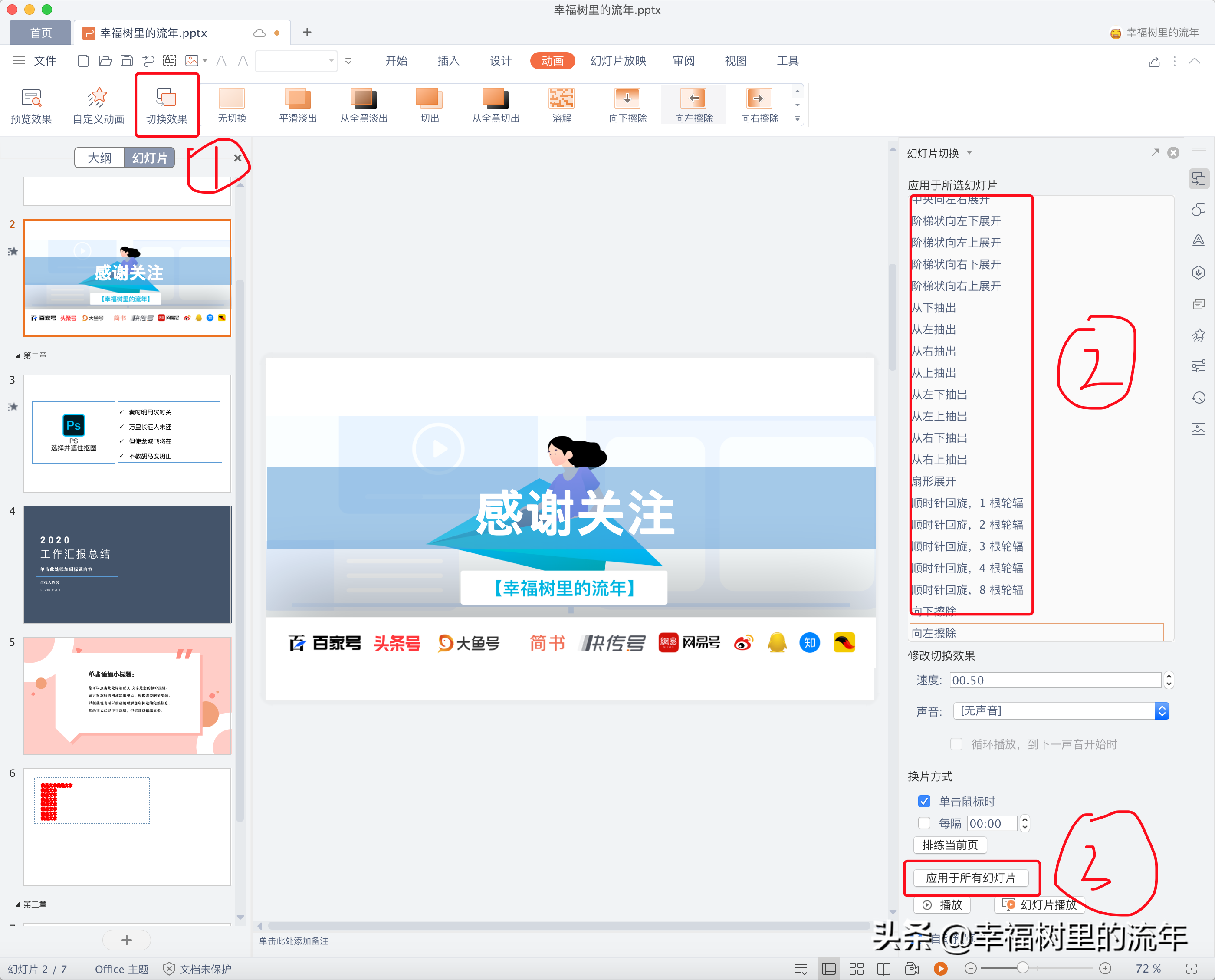 选择-【动画】-【切换效果】-选择一个效果-【应用于所有幻灯片】