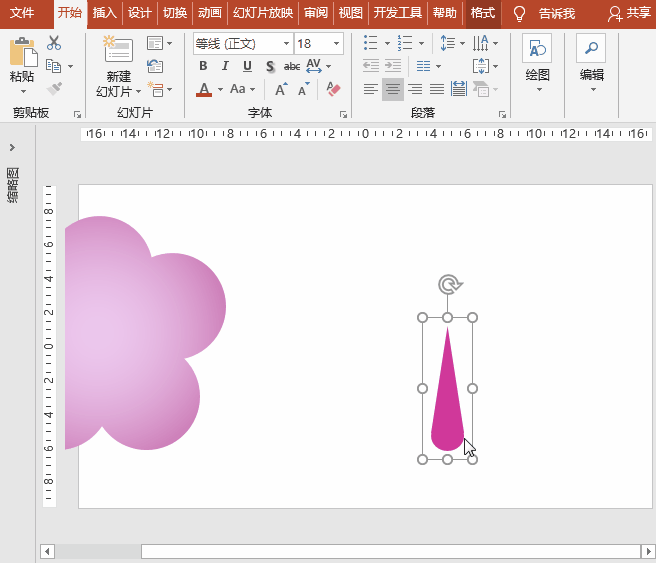 执行“插入”菜单-“形状”-“基本形状”-“等腰三角形”,拖动鼠标绘制一个等腰三角形;同样执行插入“椭圆”命令,按住Shift键在三角形的底边绘制一个正圆,选择三角形和椭圆,选择“格式”菜单,设置填充为粉色、线条为无;右键“组合”;