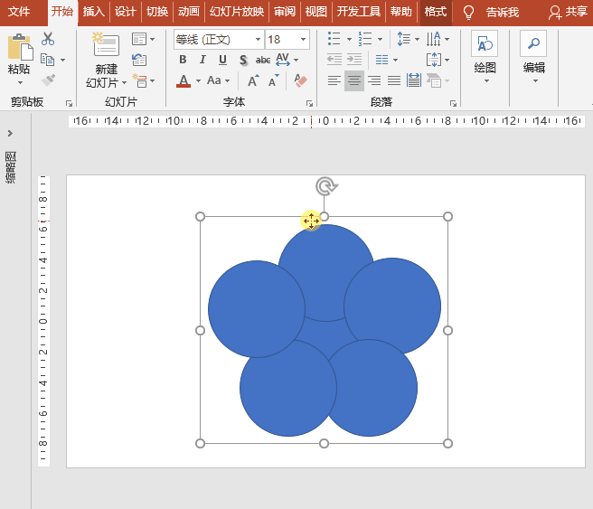打开PowerPoint2016软件,新建幻灯片;执行“插入”菜单-“形状”-“基本形状”-“五边形”,按住Shift键在幻灯片的中央绘制一个适当大小的五边形;同样执行插入“椭圆”命令,按住Shift键在五边形的一角中插入适当大小的圆形;选择圆形,按住Ctrl键拖动,使五边形的每个角点都布置一个圆形。全选五边形和圆形,右键“组合”。