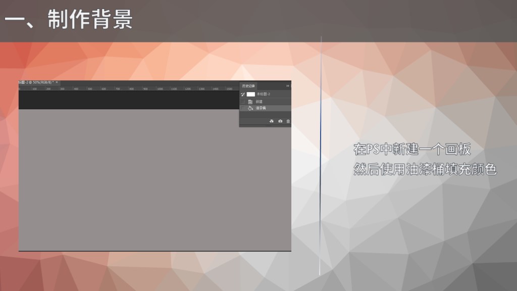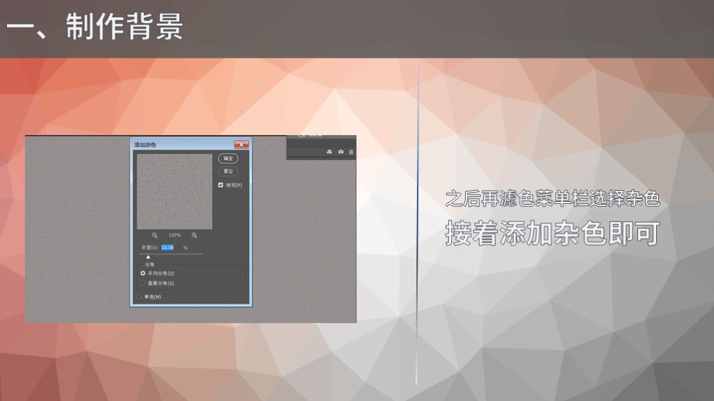 制作背景是使用PS制作的,因为如果在PPT中使用纯色或者渐变色填充的话,颜色可以很好看,但是背景会缺少质感。所以在PS中使用油漆桶进行颜色填充之后,然后再滤镜菜单栏,选择杂色,添加杂色功能,给背景添加一些杂色,让背景更加有质感。