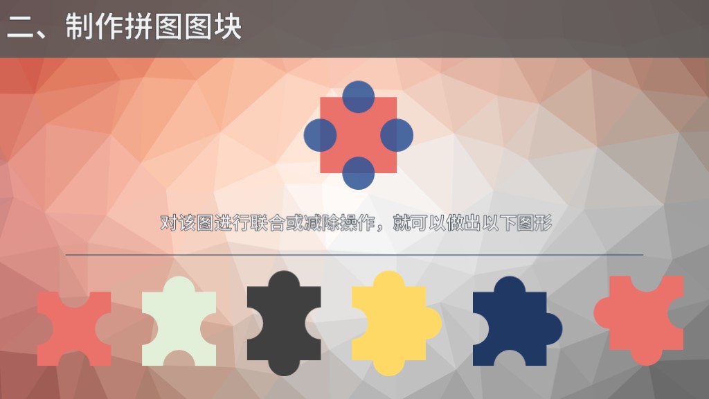 拼图块的的制作是使用新建正方形和圆形两个图形。然后使用布尔预算中的联合或者减除功能,就是可以组合成各种不同的拼图图块,然后利用这些图块,做成需要的拼图样子,最后与图片相结合。