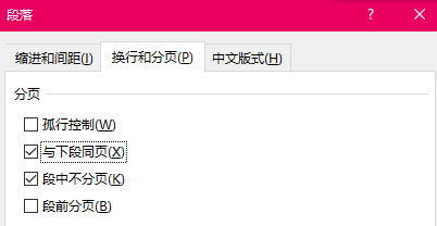 去掉的方法是,把鼠标放在标题上,右键设置段落格式,选择换行和分页,分别把与下段同页和段中不分页前面的勾去掉。