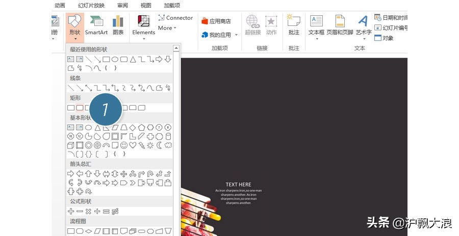 具体操作如下:新建一个PPT,插入一个长方形,填满整个PPT页面,将颜色设置为灰色,紧接着插入圆角矩形。(下图1处)