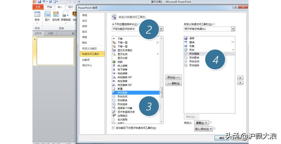 接下来利用PPT2010的图形相交功能搞定。PPT2010的图形相交功能是一个“隐藏”功能,需要利用自定义QAT工具栏打开。