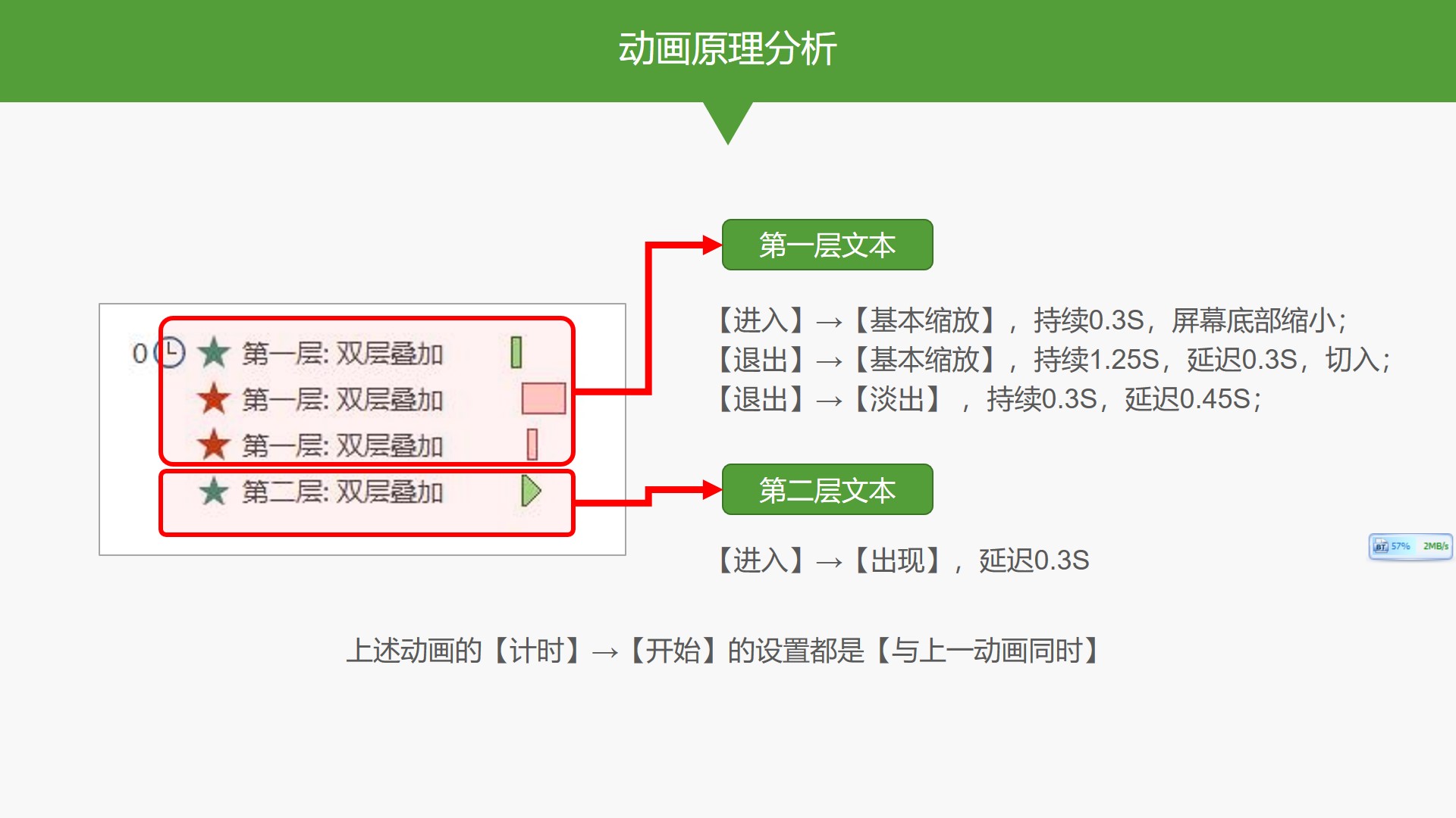 我们通过【动画】→【动画窗格】调出动画明细可以看到,第一层文本设置了三个动画效果,即上一期所讲的「同一对象的多个动画效果叠加」的具体应用:分别是①【进入】→【基本缩放】,持续0.3S,屏幕底部缩小;②【退出】→【基本缩放】,持续1.25S,延迟0.3S,切入;③【退出】→【淡出】 ,持续0.3S,延迟0.45S;第二层文本设置了一个动画效果:【进入】→【出现】,延迟0.3S;上述动画的【计时】→【开始】的设置都是【与上一动画同时】。