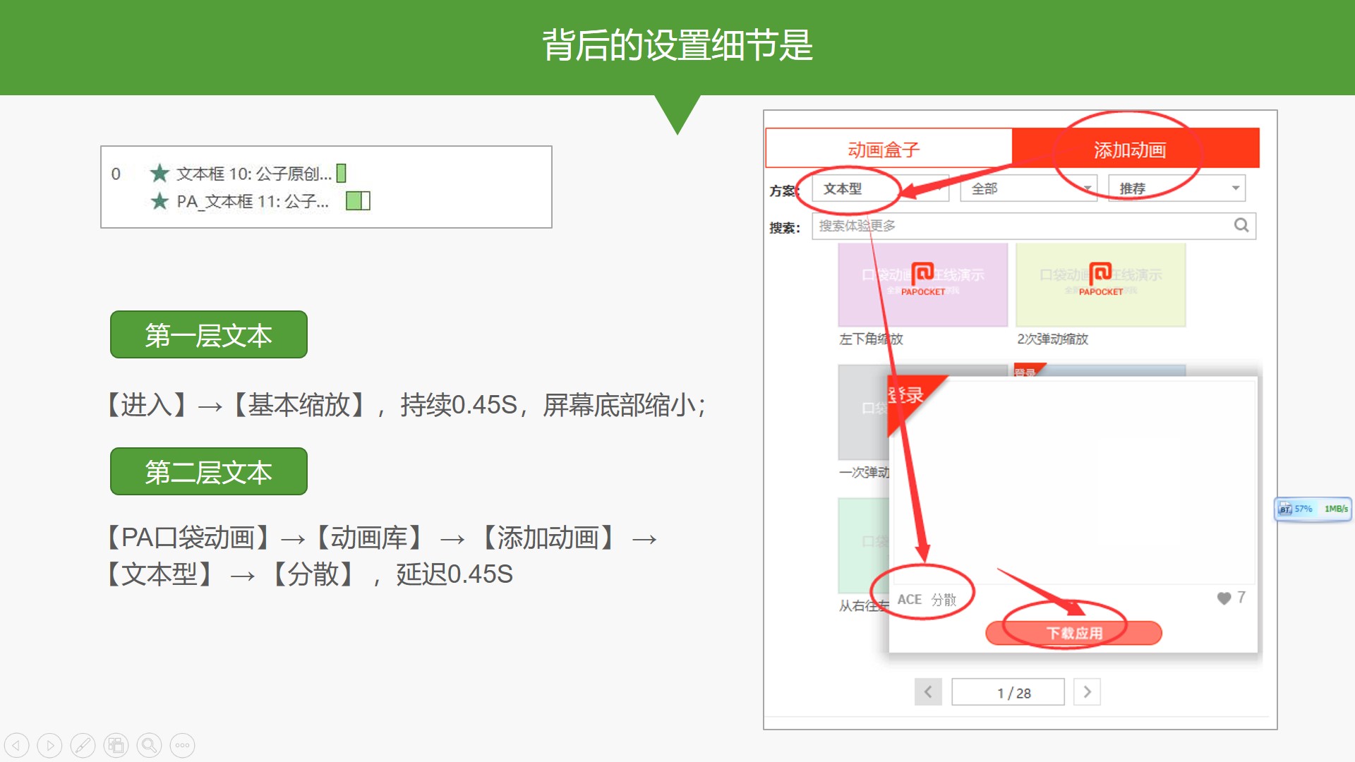 背后的设置细节是:第一层文本设置了【基本缩放】动画,持续0.45S,屏幕底部缩小;第二层文本引用了【PA口袋动画】中的文本动画效果:【PA口袋动画】→【动画库】 → 【添加动画】 → 【文本型】 → 【分散】 ,延迟0.45S;您也可以动手试试哦。