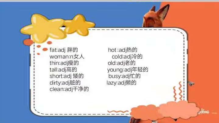 那么,创意来自于哪里呢?这主要和你授课的内容有关系。因为目前我讲授的内容都是新概念教材。接触的是小学的孩子,为了吸引他们的兴趣,我的每一个课件都比较卡通。为了做好课件,我首先选主题。选择的主题一定要和本节所讲授的内容紧密相联。在这里,我以新概念第一册第10课为例:这节课的主要内容是一些形容词的有法。这些形容词包括描述人的外貌特征、天气状况等等。我苦思冥想了好久,最后决定用“疯狂动物城”这个主题来做。
