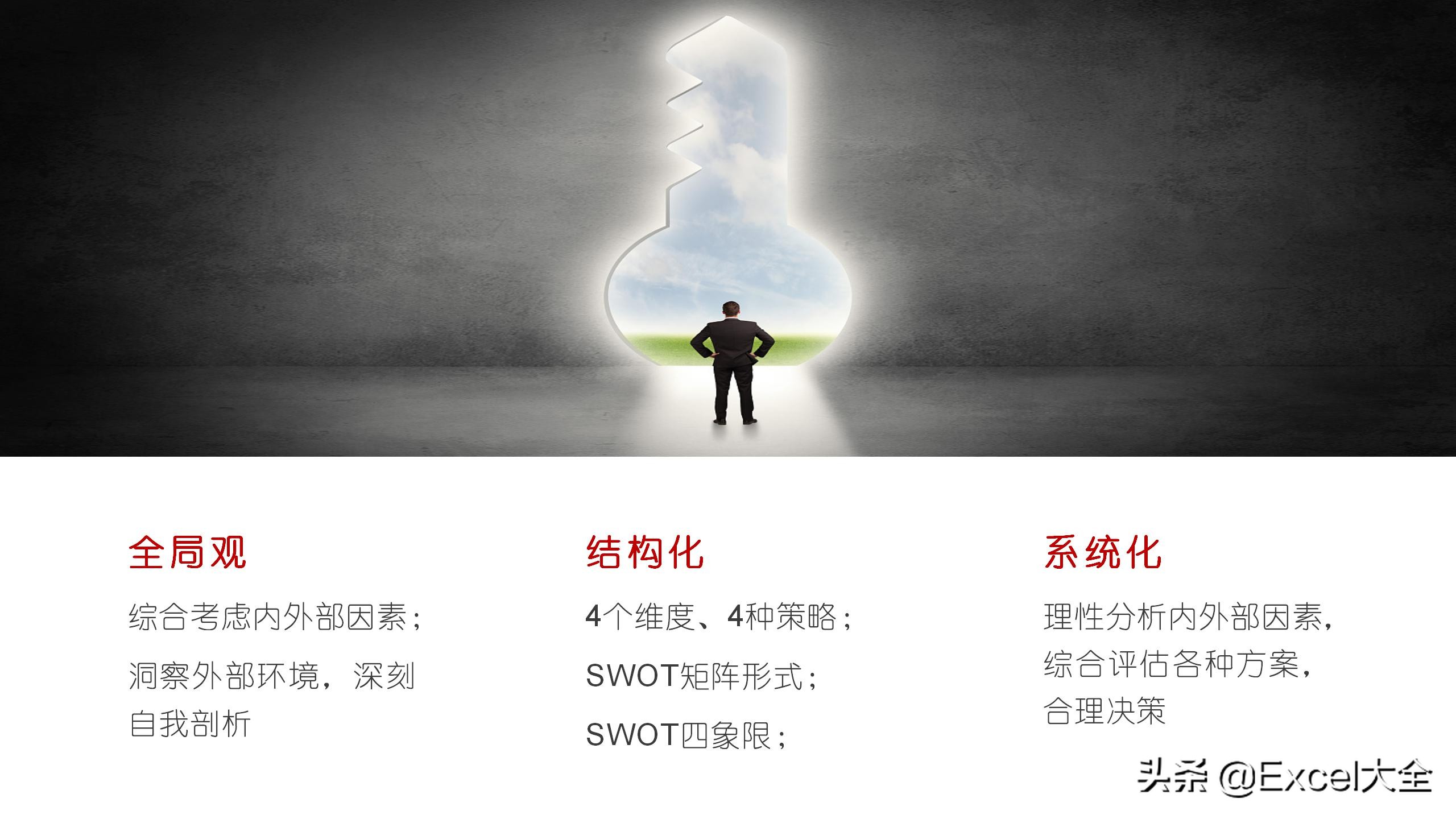 企业战略规划、产品规划、个人的人生规划、职业规划,甚至是,一场演讲、一次会议、一项决定,都用得到SWOT分析。