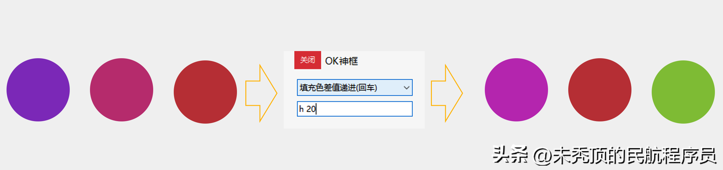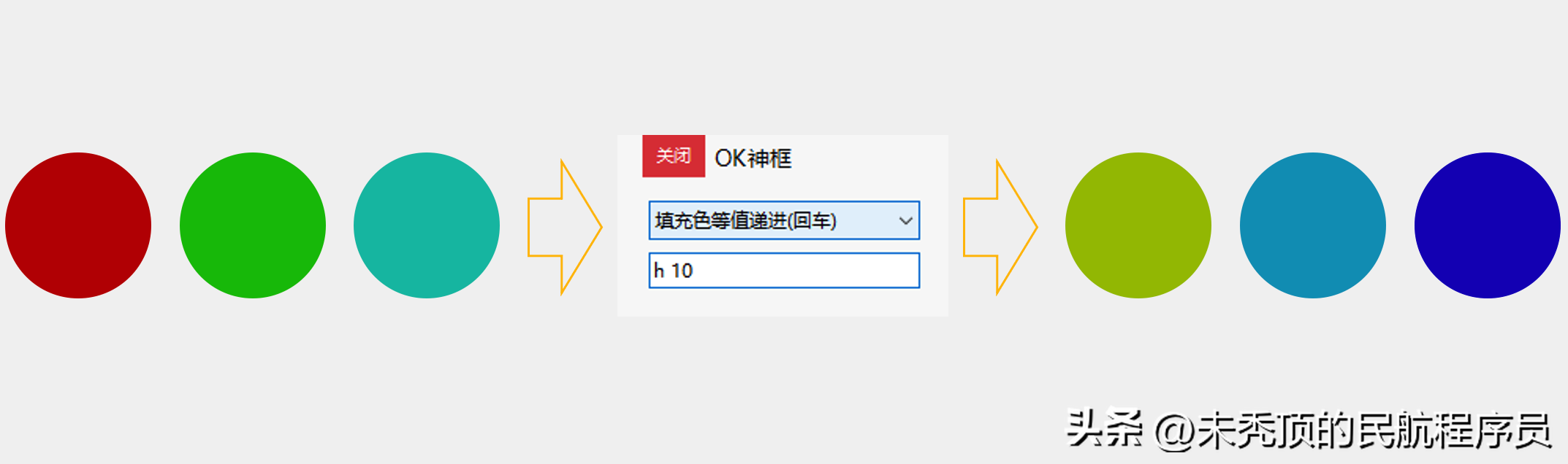 1.选中多个矢量形状,输入颜色类型+分隔符+色值,敲回车。如:h 10,表示第一个形状的填充色的色调增加10、第二个形状的色调增加20、以此类推