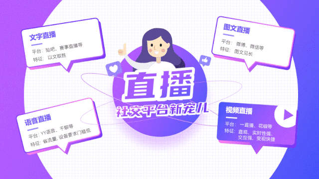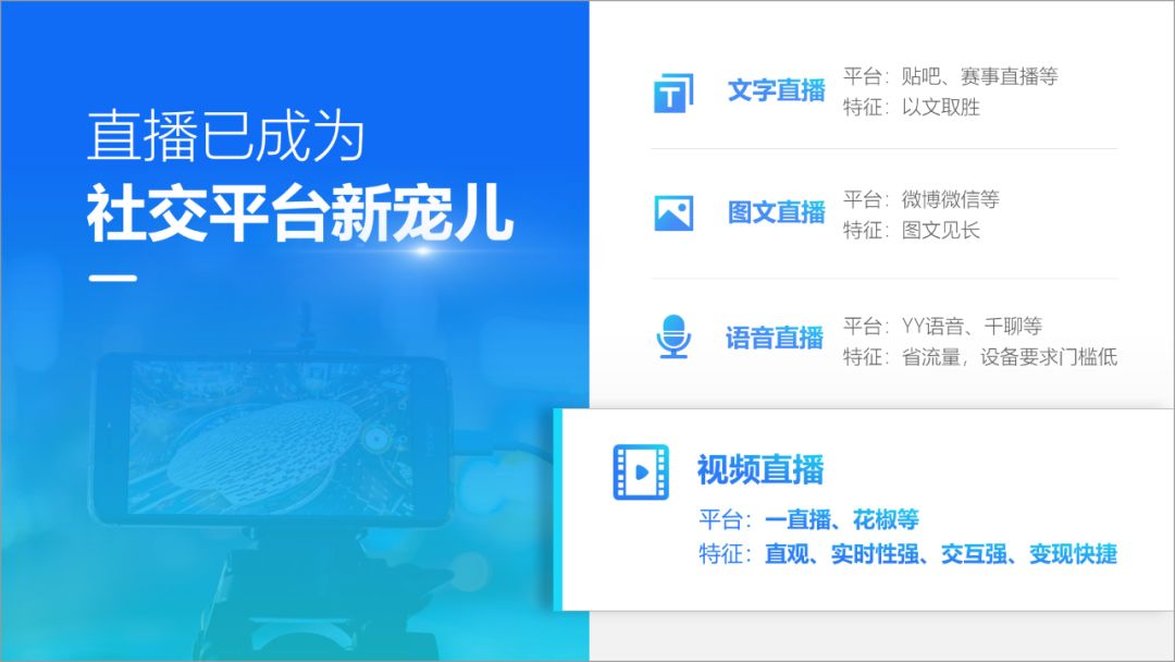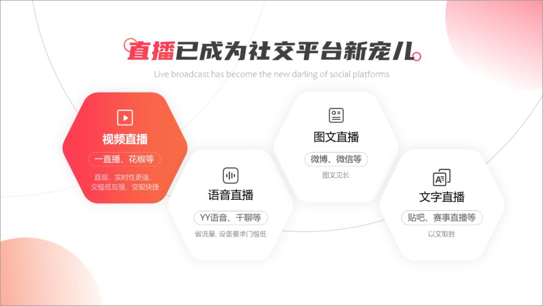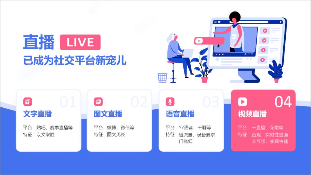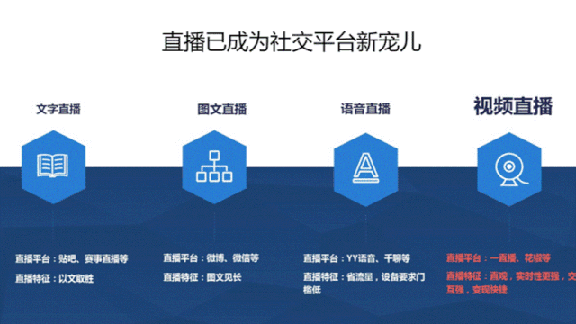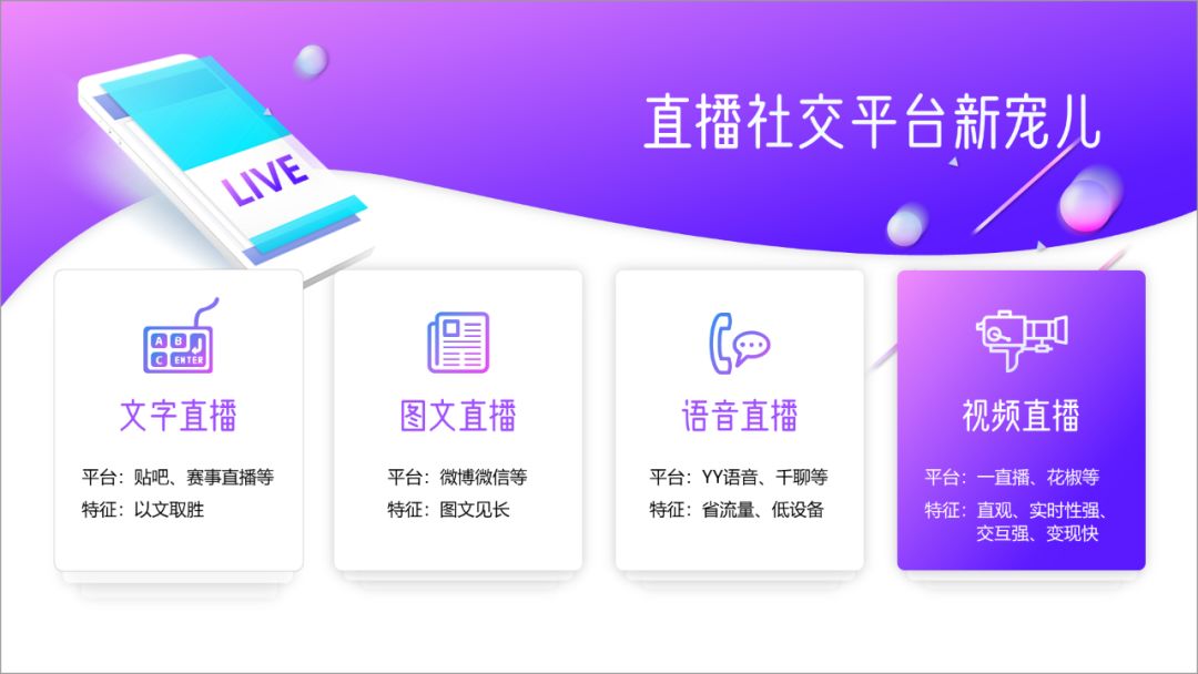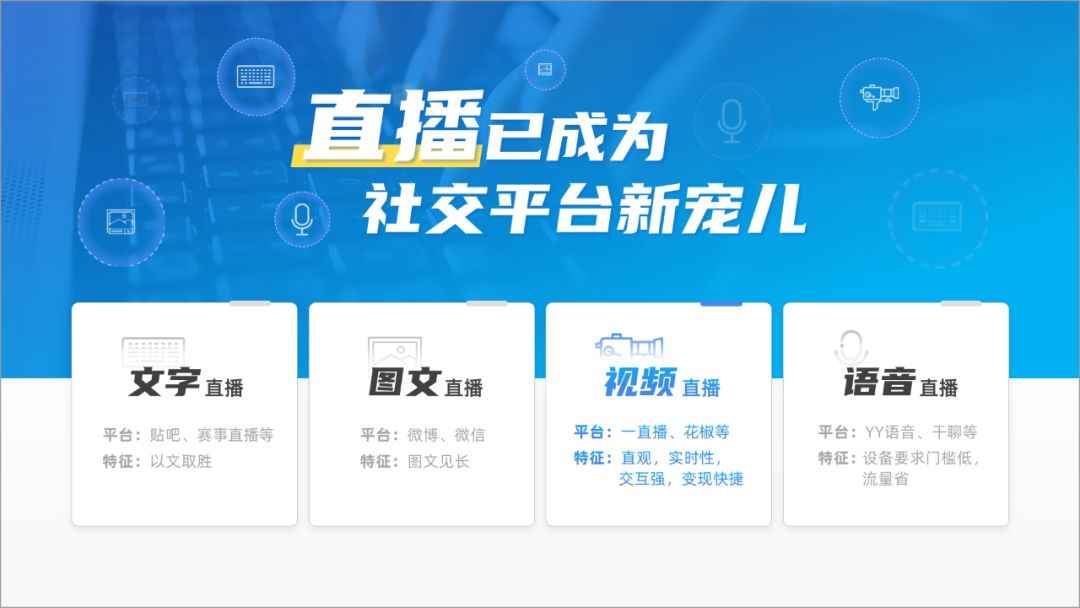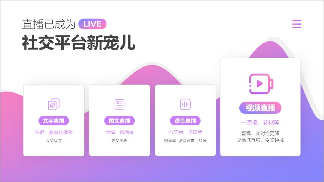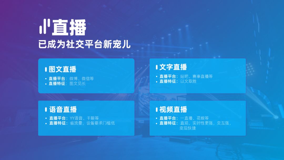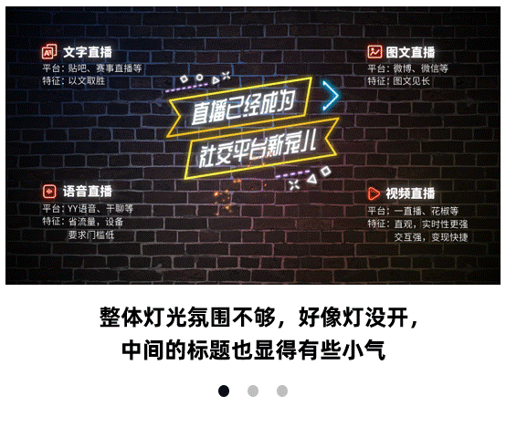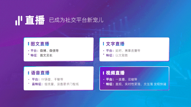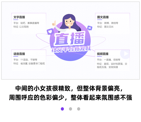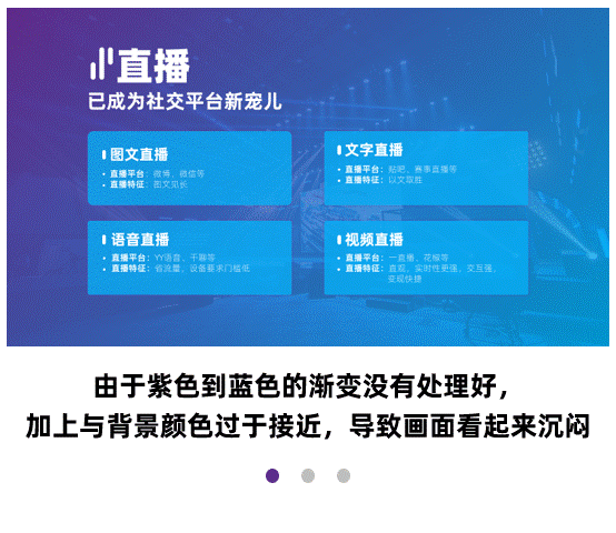 改进思路 Step1: 由于紫色到蓝色的渐变没有处理好,加上与背景颜色过于接近,导致画面看起来沉闷。 Step2: 调整下背景以及四个标题的渐变,色彩对比更明显,标题改为一行使上部空间更饱满,更改背景色强调一下视频直播。 Step3: 画两个弧形,增加背景层次,四个矩形添加渐变描边也会更精致一些。