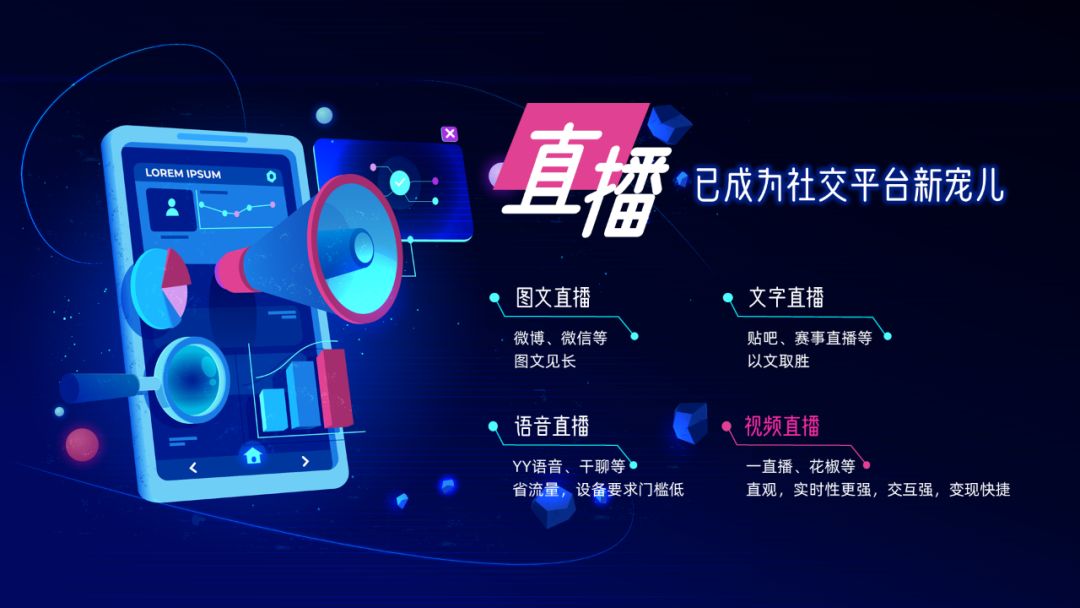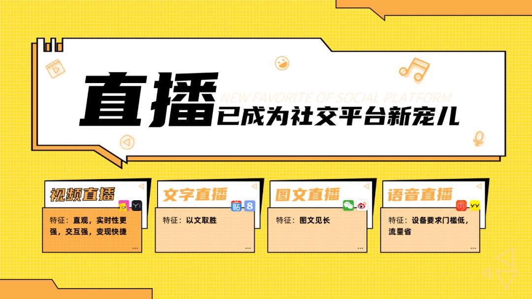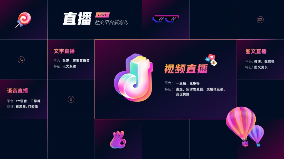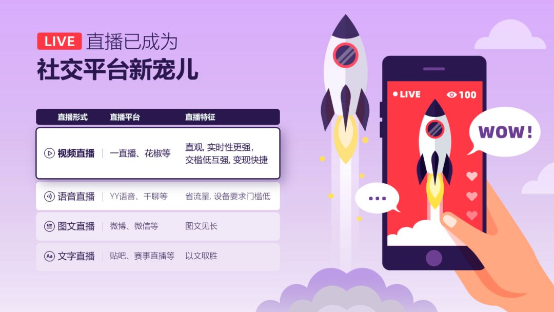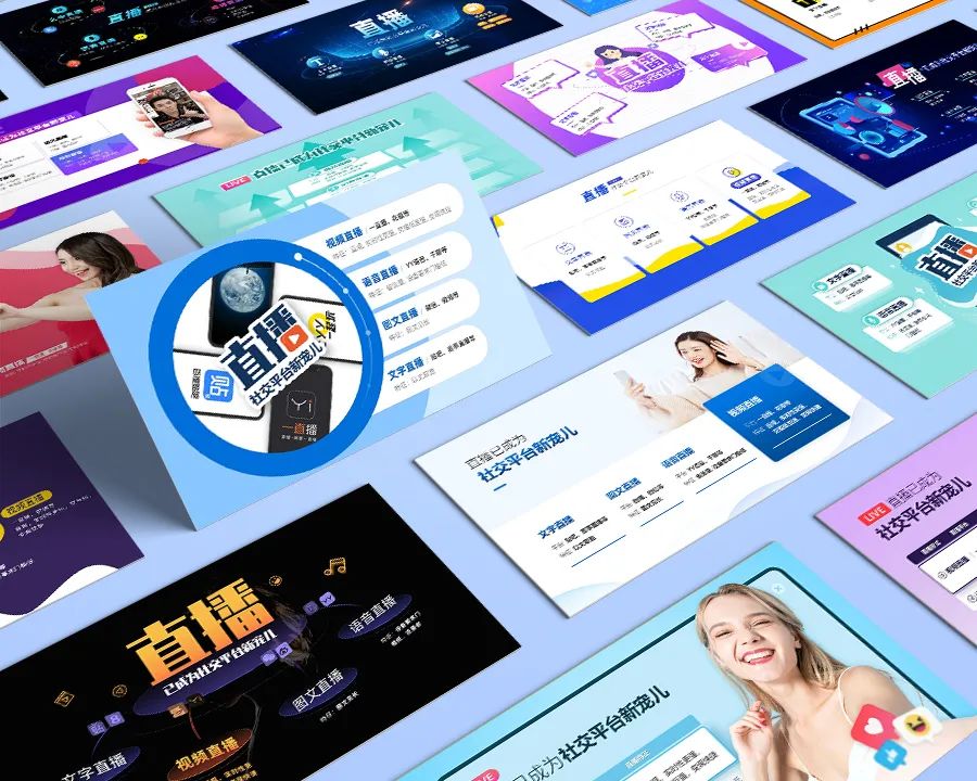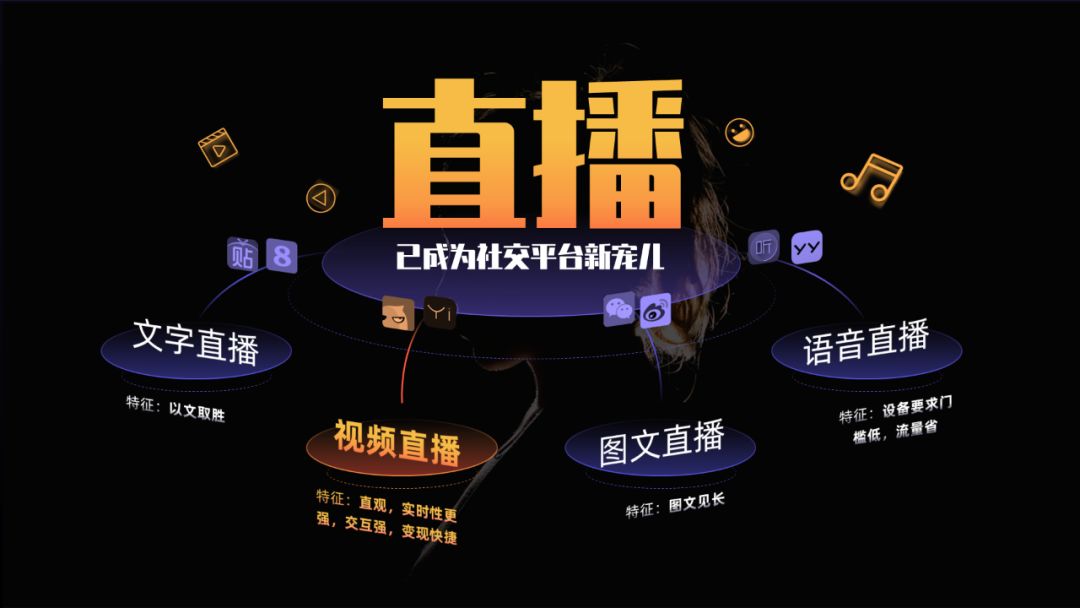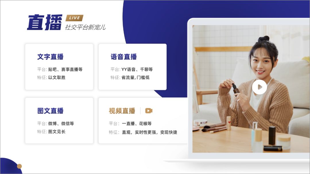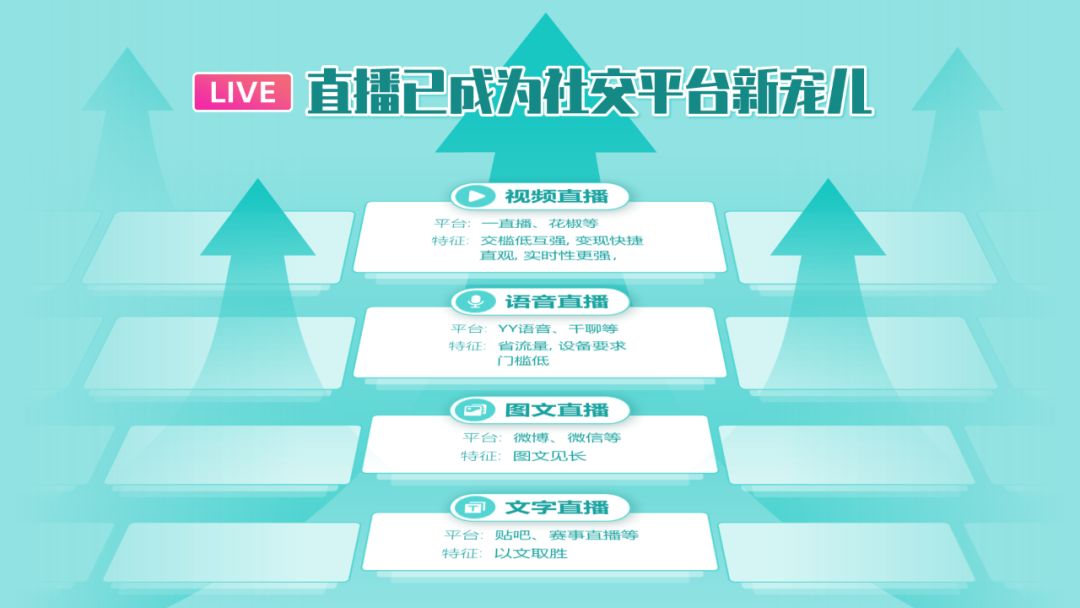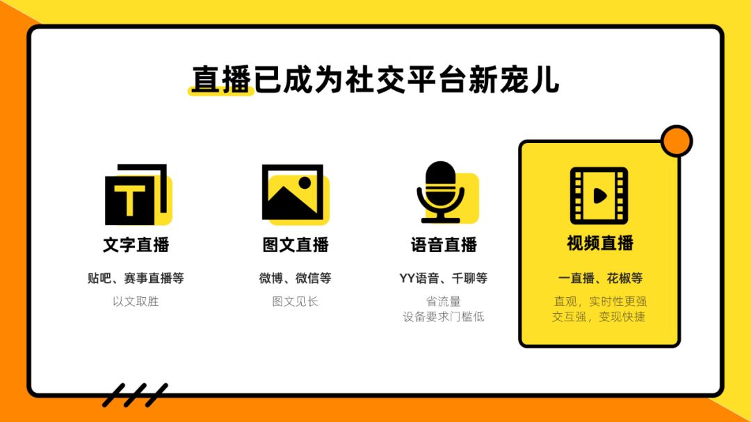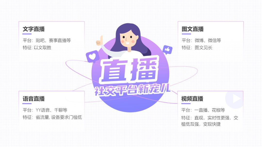 改进思路 Step1: 由于紫色到蓝色的渐变没有处理好,加上与背景颜色过于接近,导致画面看起来沉闷。 Step2: 调整下背景以及四个标题的渐变,色彩对比更明显,标题改为一行使上部空间更饱满,更改背景色强调一下视频直播。 Step3: 画两个弧形,增加背景层次,四个矩形添加渐变描边也会更精致一些。