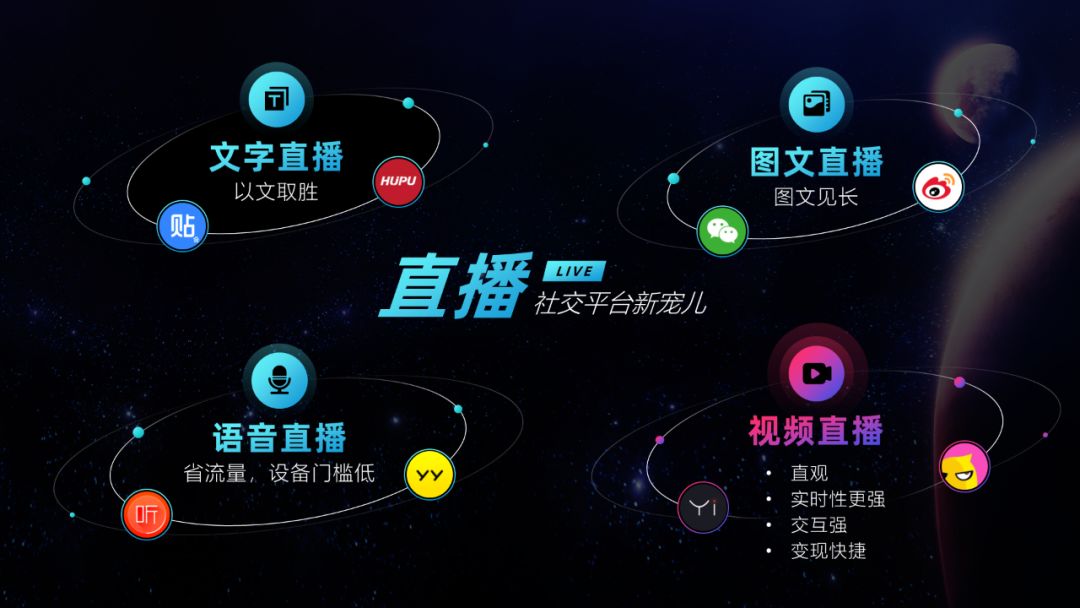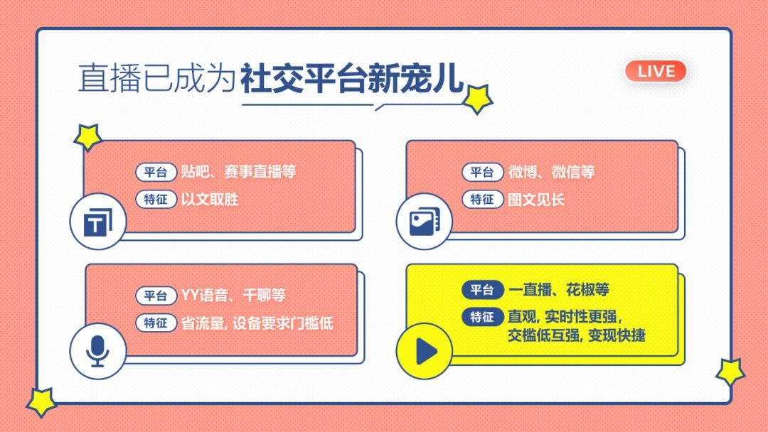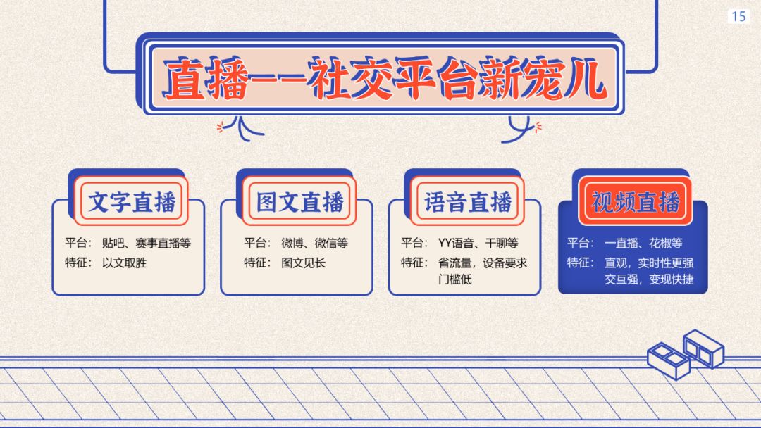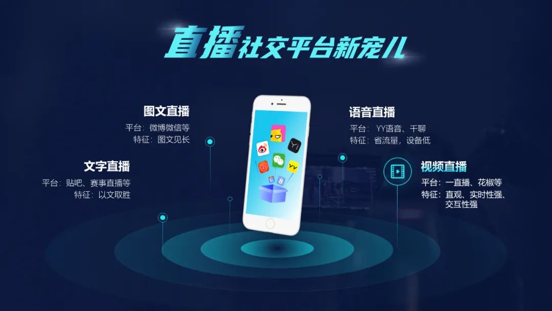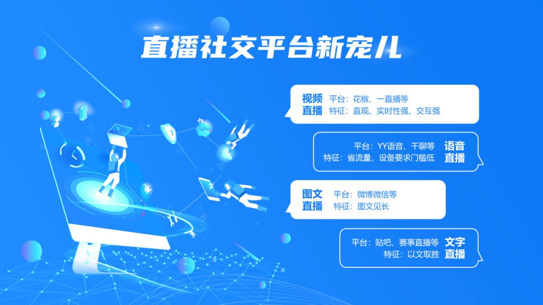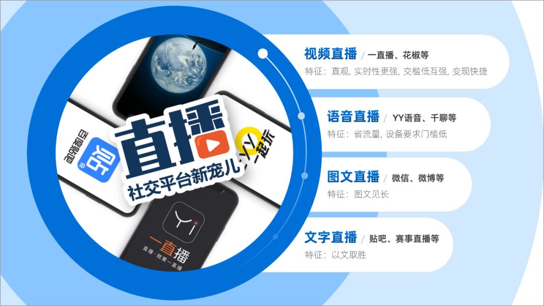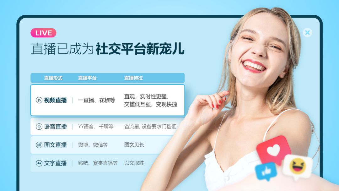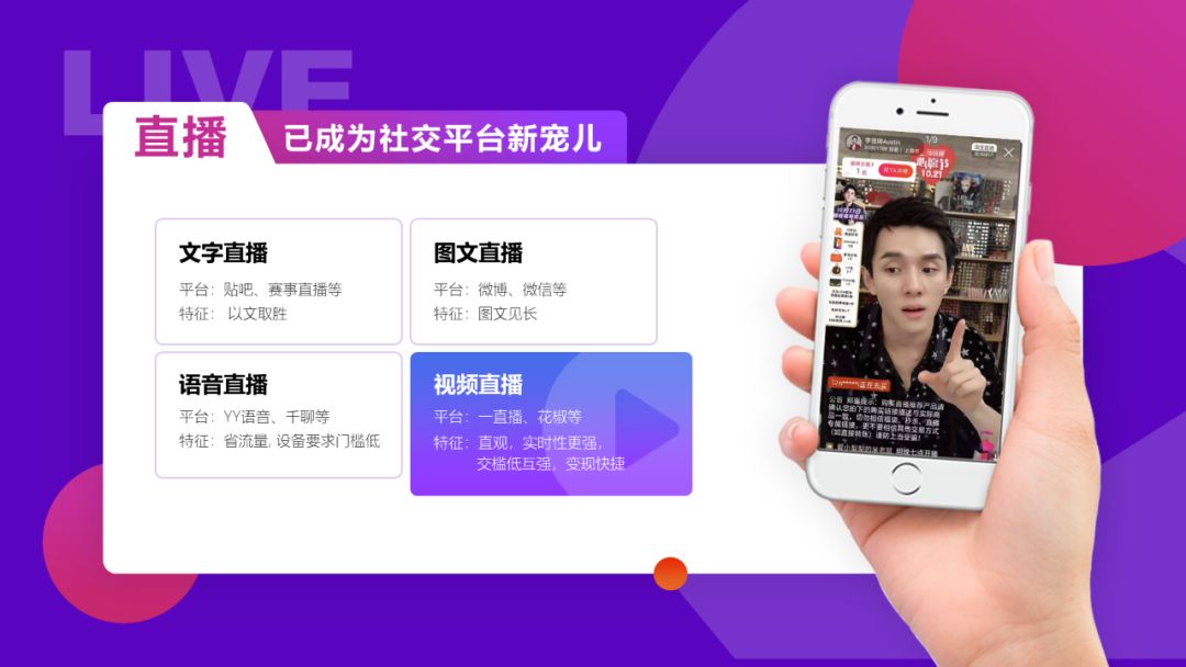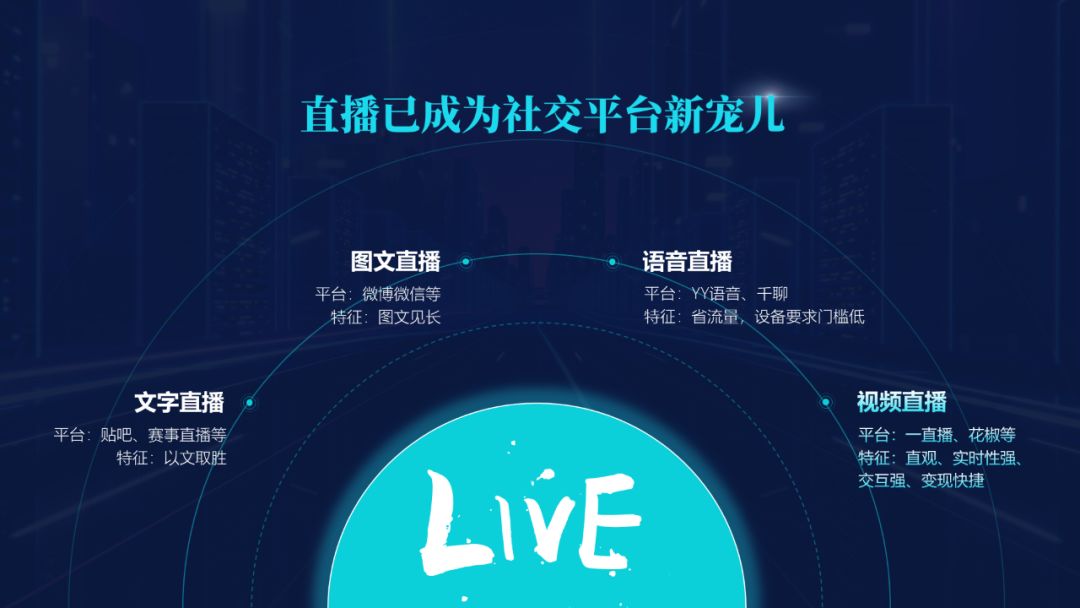 改进思路 Step1: 由于紫色到蓝色的渐变没有处理好,加上与背景颜色过于接近,导致画面看起来沉闷。 Step2: 调整下背景以及四个标题的渐变,色彩对比更明显,标题改为一行使上部空间更饱满,更改背景色强调一下视频直播。 Step3: 画两个弧形,增加背景层次,四个矩形添加渐变描边也会更精致一些。
