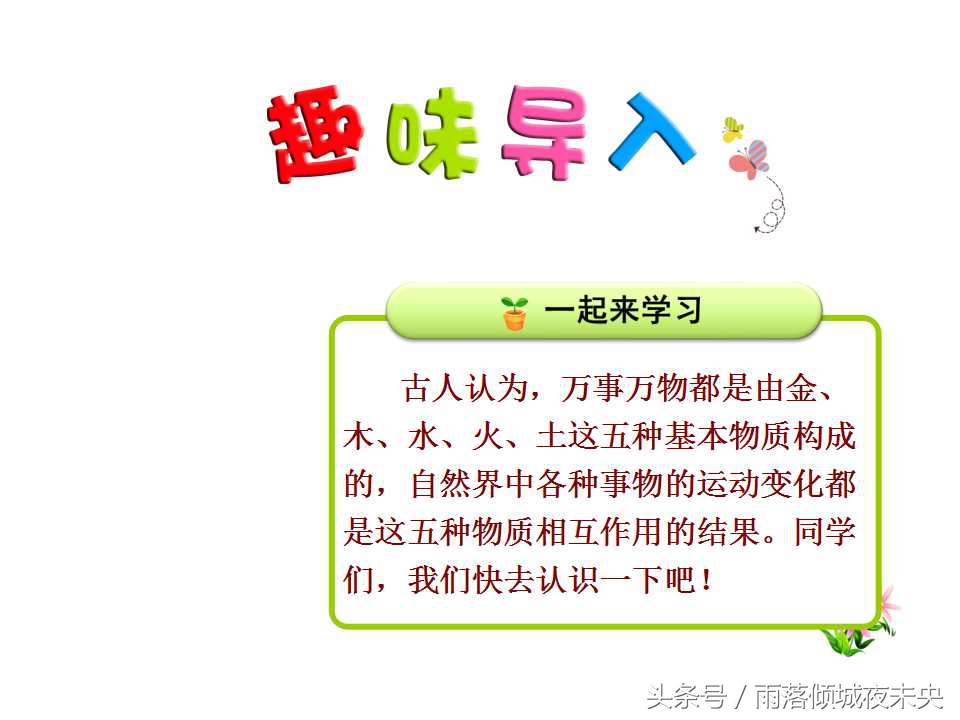 古人认为,万事万物都是由金、木、水、火、土这五种基本物质构成的,自然界中各种事物的运动变化都是这五种物质相互作用的结果。同学们,我们快去认识一下吧!