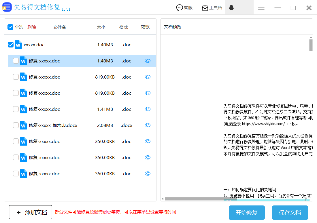 在我们的工作和学习中,会遇到各种文件,而出现的问题不可能全部都能修复好,如果依照上面的方法无法实现,那我们只能通过专业的修复软件进行修复了。这里我们就直接以失易得文档修复软件为例,来说一下文件损坏如何修复的。