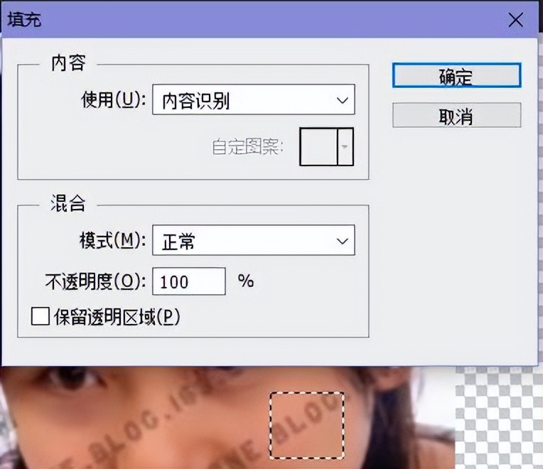 也可以用矩形选框选中要去除的某一小部分,然后按Shift+F5,选择用内容识别来填充,也能起到一定的去除水印的效果: