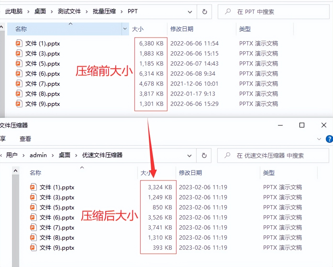 操作步骤5:如图所示,是压缩前后的PPT文件大小对比图,很明显,压缩后的PPT比压缩小了很多,说明压缩效果很好。