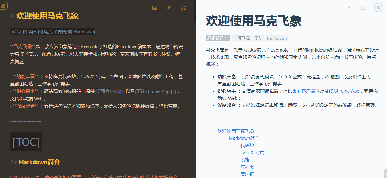 如果你不会使用Markdown语法,那你就OUT了!Markdown 是 2004 年由 John Gruberis 设计和开发的纯文本格式的语法,非常的简单实用。Markdown 是一种轻量级标记语言,它允许人们使用易读易写的纯文本格式编写文档,然后转换成格式丰富的HTML页面。马克飞象是一款专为印象笔记(Evernote)打造的Markdown编辑器,通过精心的设计与技术实现,配合印象笔记强大的存储和同步功能,带来前所未有的书写体验。支持高亮代码块、LaTeX 公式、流程图,本地图片以及附件上传,甚至截图粘贴,工作学习好帮手。提供桌面客户端以及离线Chrome App,支持移动端 Web。支持选择笔记本和添加标签,支持从印象笔记跳转编辑,轻松管理。