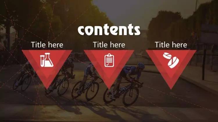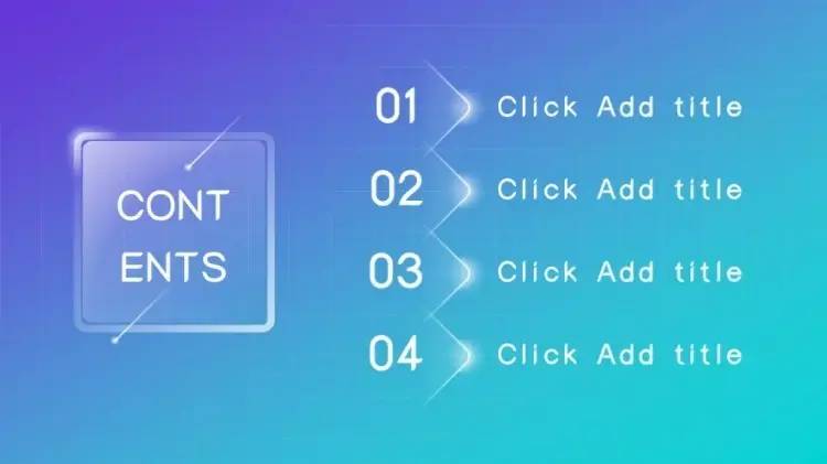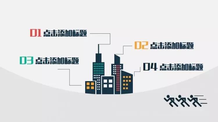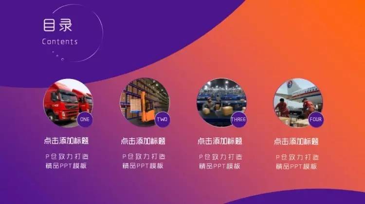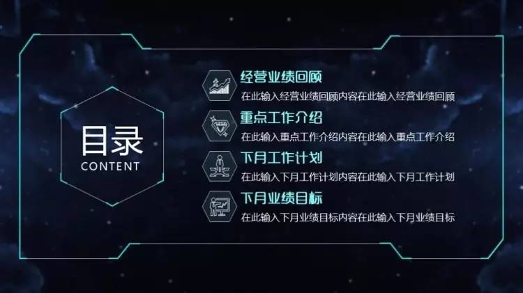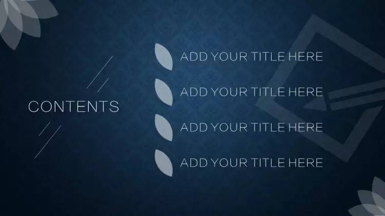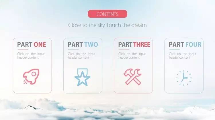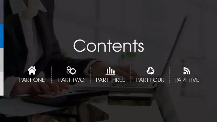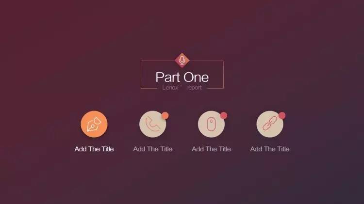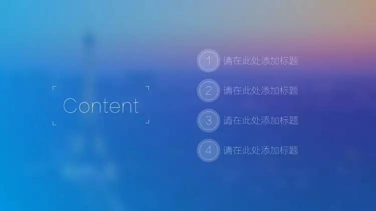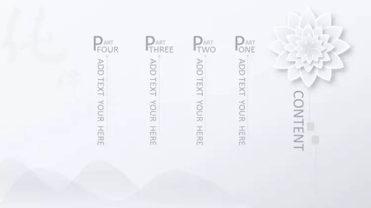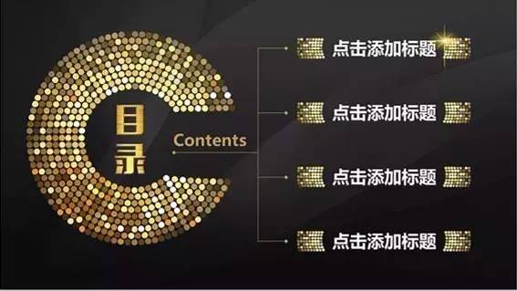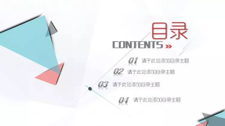 做法是:把「目录」放在幻灯片版面的上方的1/4个位置左右,居中对齐,各章节的小标题则放在下方(通常在2/4到3/4之间的位置)横向对齐(注意每个章节间的间隔要尽量保持一致),同样也可以加一些小图标或者图形,加以修饰