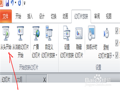 15.然后就要点击功能区的幻灯片放映的“从头开始”。